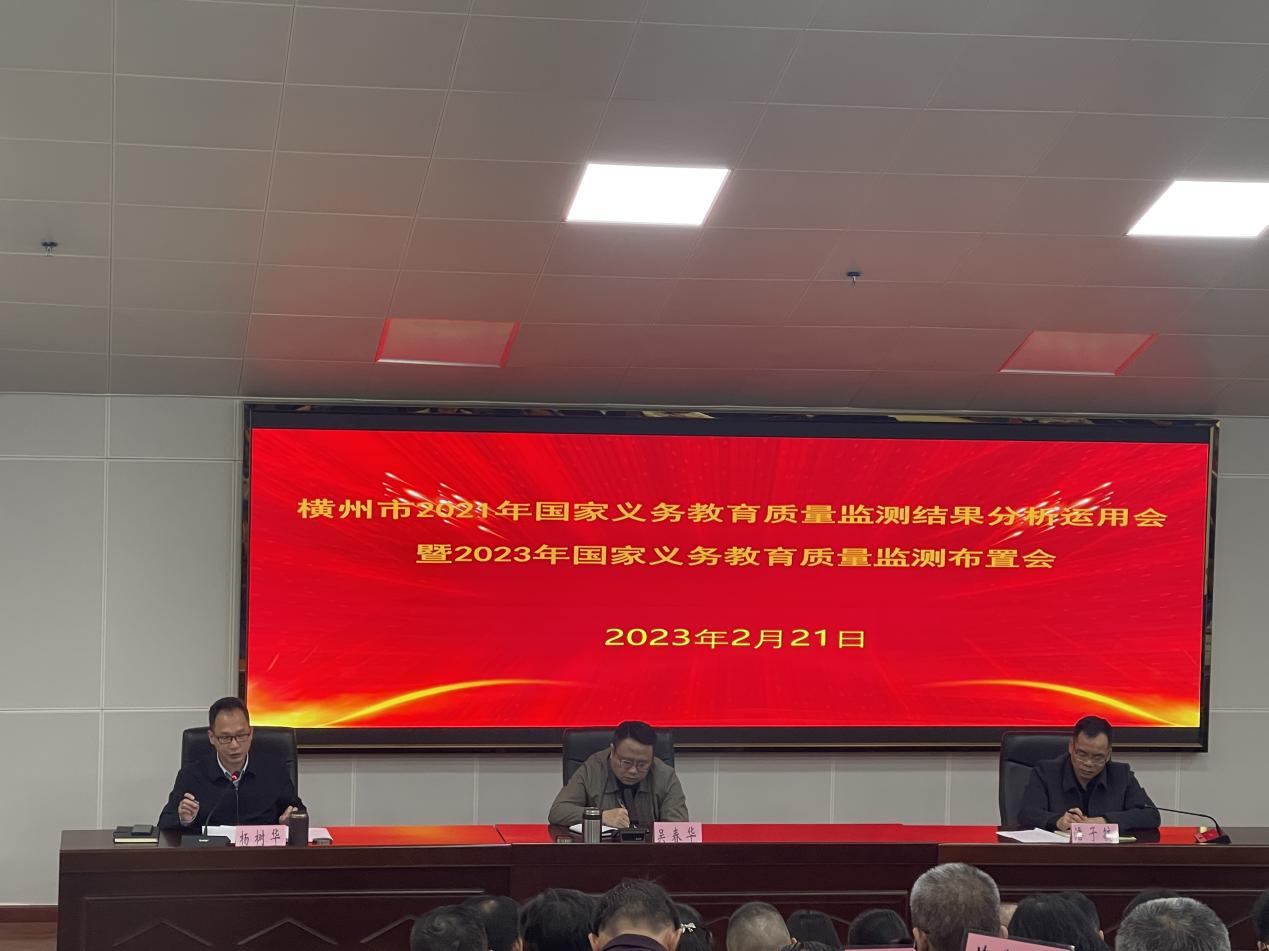 为做好横州市2021年国家义务教育质量监测结果问题整改,推进2023年国家义务教育质量监测工作,进一步把思想统一到上级的部署要求上来,推动义务教育质量监测上新台阶。2月21日,横州市教育局召开横州市2021年国家义务教育质量监测结果分析运用会议暨2023年国家义务教育质量监测工作布置会。横州市委教育工委书记,市教育局党组书记、局长吴春华,横州市委教育工委副书记,市教育局党组成员、副局长潘子毓出席会议并讲话,横州市委教育工委委员,市教育局党组成员、副局长杨树华主持会议。